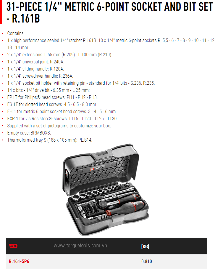 - Toàn bộ bộ khẩu Facom R.161-5P6 đóng trong hộp nhựa, trọng lượng: 0.81 kg. Made in France.
