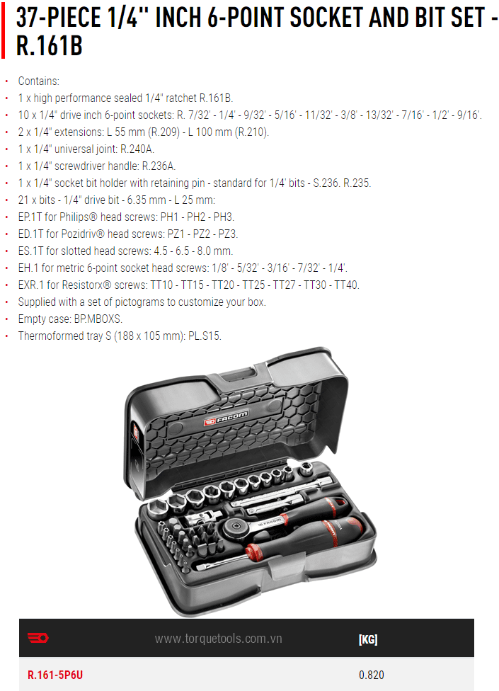 - Toàn bộ bộ khẩu Facom R.161-5P6U đóng trong hộp nhựa, trọng lượng: 0.82 kg. Made in France.