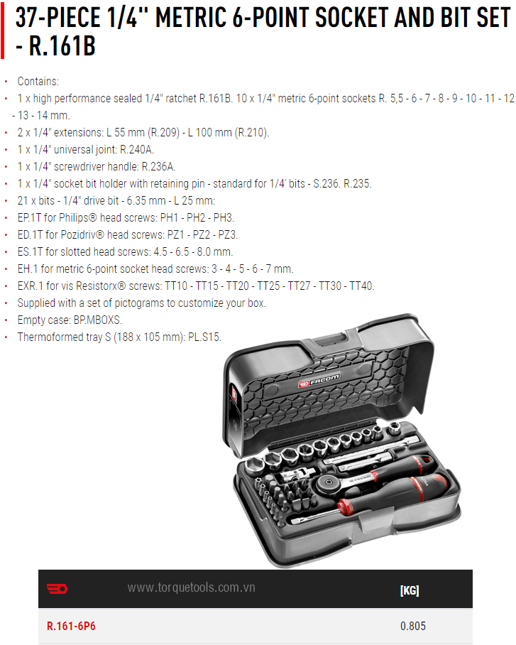 - Toàn bộ bộ khẩu Facom R.161-6P6 đóng trong hộp nhựa, trọng lượng: 0.805 kg. Made in France.