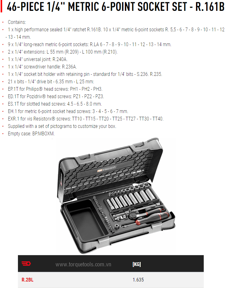 - Toàn bộ bộ khẩu Facom R.2BL đóng trong hộp nhựa, trọng lượng: 1.635 kg. Made in France.