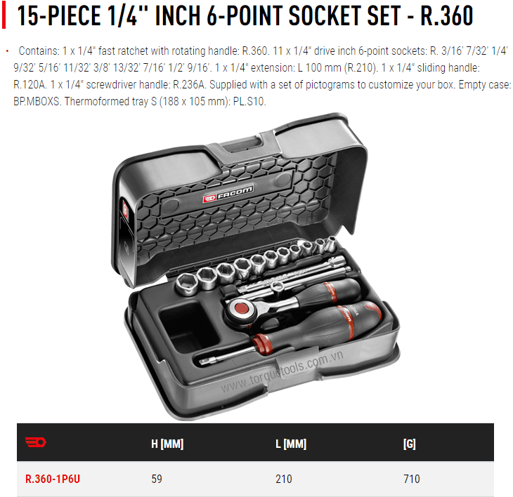 - Toàn bộ bộ khẩu Facom R.360-1P6U đóng trong hộp nhựa, trọng lượng: 0.7 kg. Made in France.