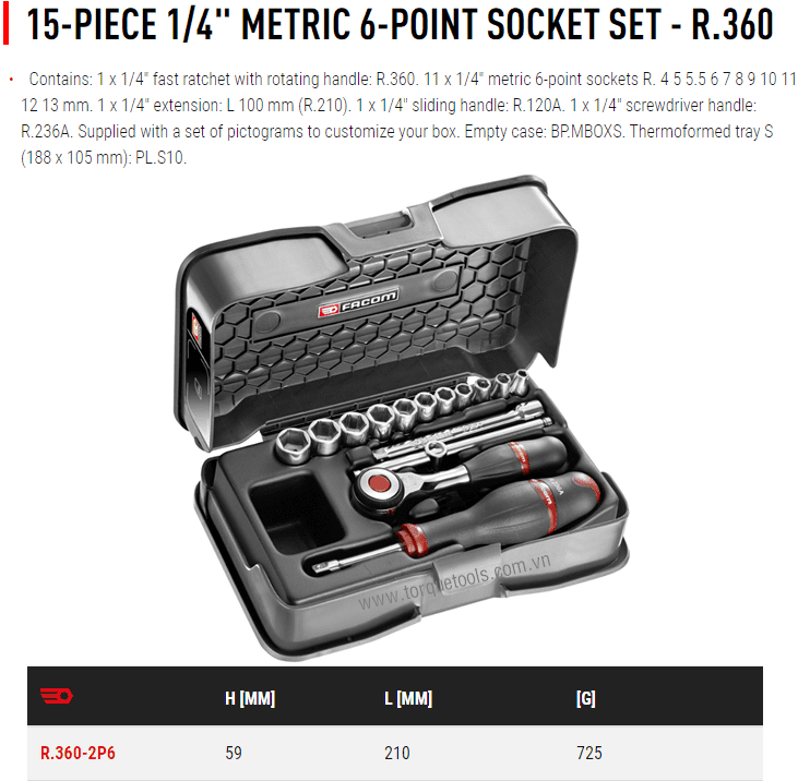 - Toàn bộ bộ khẩu Facom R.360-2P6 đóng trong hộp nhựa, trọng lượng: 0.725 kg. Made in France.