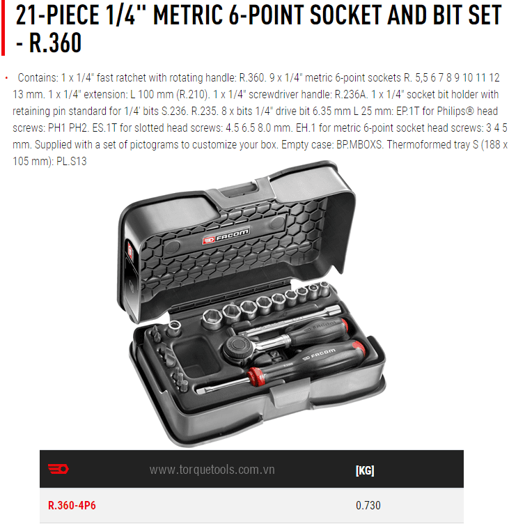 - Toàn bộ bộ khẩu Facom R.360-4P6 đóng trong hộp nhựa, trọng lượng: 0.730 kg. Made in France.