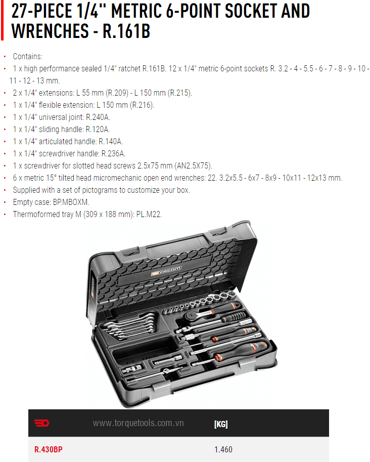- Toàn bộ bộ khẩu Facom R.430BP đóng trong hộp nhựa, trọng lượng: 1.46 kg. Made in France.
