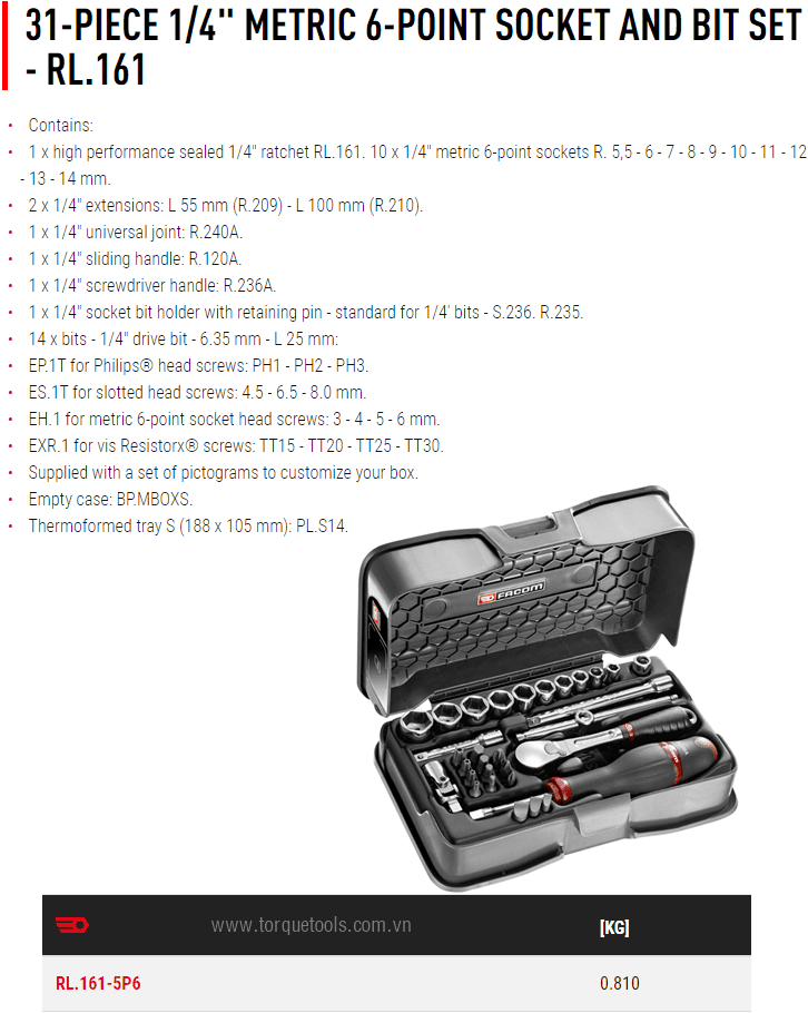 Bộ dụng cụ Facom RL.161-5P6, bộ khẩu Facom RL.161-5P6 là hộp dụng cụ 31 chi tiết, size khẩu đầu vào 1/4", chuyên dùng để siết/vặn bulong, đai ốc, vít trong công nghiệp.Các chi tiết trong bộ khẩu Facom RL.161-5P6 gồm: