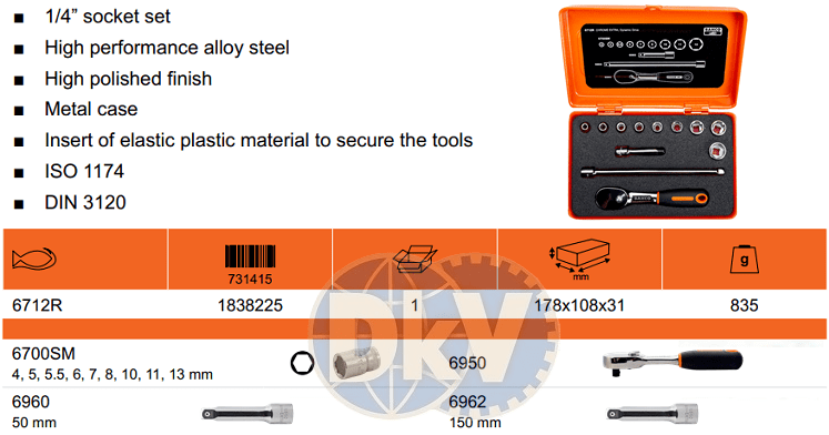 Bộ khẩu Bahco 6712R, Bahco socket set 6712R có 12 chi tiết, size khẩu đầu vào 1/4", đóng trong hộp thép, chuyên dùng để siết/vặn bulong, đai ốc, vít trong công nghiệp.Các chi tiết trong bộ khẩu Bahco 6712R gồm: