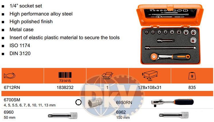 Bộ khẩu Bahco 6712RN, Bahco socket set 6712RN có 12 chi tiết, size khẩu đầu vào 1/4", đóng trong hộp thép, chuyên dùng để siết/vặn bulong, đai ốc, vít trong công nghiệp.Các chi tiết trong bộ khẩu Bahco 6712RN gồm: