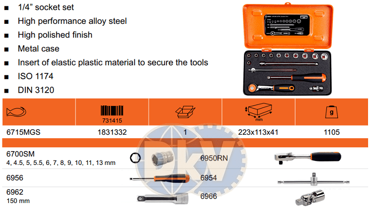 Bộ khẩu Bahco 6715MGS, Bahco socket set 6715MGS có 16 chi tiết, size khẩu đầu vào 1/4", đóng trong hộp thép, chuyên dùng để siết/vặn bulong, đai ốc, vít trong công nghiệp.Các chi tiết trong bộ khẩu Bahco 6715MGS gồm: