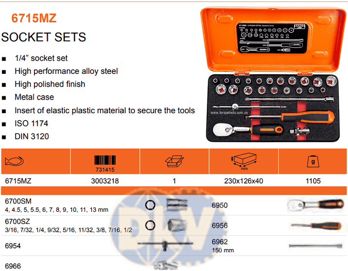 - Toàn bộ bộ khẩu Bahco 6715MZ đóng trong hộp thép (230 x 126 x 40 mm), trọng lượng: 1.105 kg. Made in USA.