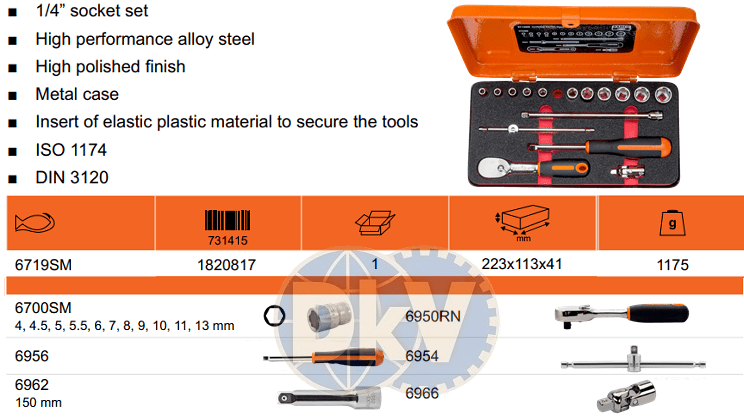 Bộ khẩu Bahco 6719SM, Bahco socket set 6719SM có 17 chi tiết, size khẩu đầu vào 1/4", đóng trong hộp thép, chuyên dùng để siết/vặn bulong, đai ốc, vít trong công nghiệp.Các chi tiết trong bộ khẩu Bahco 6719SM gồm: