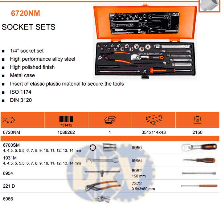 Bộ khẩu Bahco 6720NM, Bahco socket set 6720NM có 33 chi tiết, size khẩu đầu vào 1/4", đóng trong hộp thép, chuyên dùng để siết/vặn bulong, đai ốc, vít trong công nghiệp.Các chi tiết trong bộ khẩu Bahco 6720NM gồm: