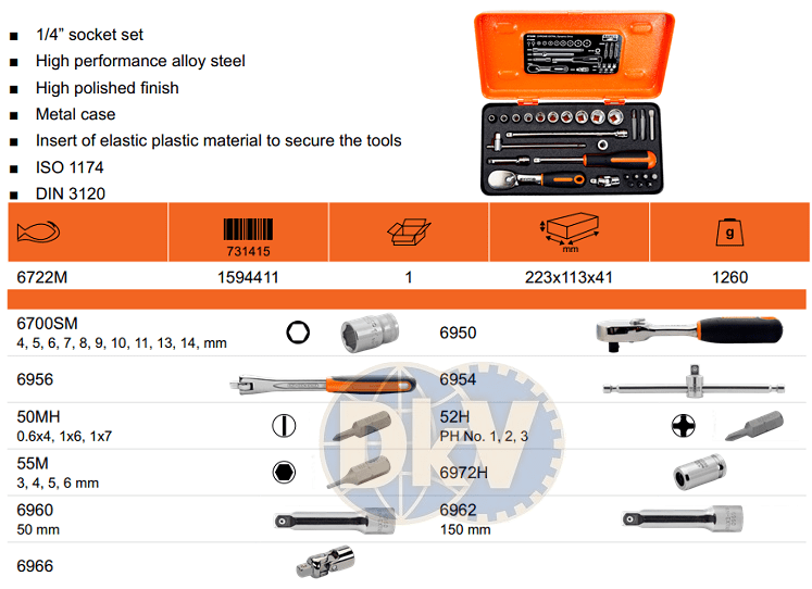 Bộ khẩu Bahco 6722M, Bahco socket set 6722M có 27 chi tiết, size khẩu đầu vào 1/4", đóng trong hộp thép, chuyên dùng để siết/vặn bulong, đai ốc, vít trong công nghiệp.Các chi tiết trong bộ khẩu Bahco 6722M gồm: