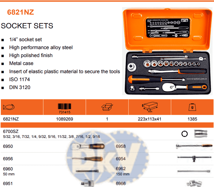 - Toàn bộ bộ khẩu Bahco 6821NZ đóng trong hộp thép (223 x 113 x 41 mm), trọng lượng: 1.385 kg. Made in USA.
