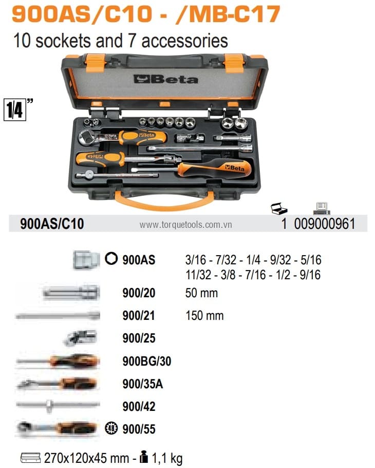 Bộ khẩu BETA 900AS/C10, BETA socket set 900AS/C10 có 17 chi tiết, size khẩu đầu vào 1/4", chuyên dùng để siết/vặn bulong, đai ốc, vít trong công nghiệp.Các chi tiết trong bộ khẩu BETA 900AS/C10 gồm: