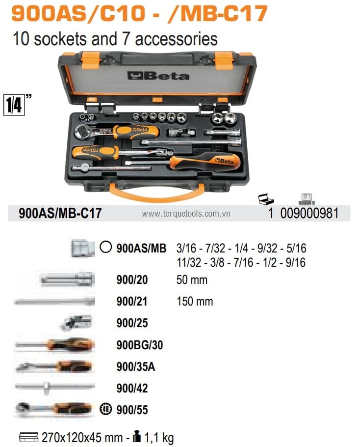 Bộ khẩu BETA 900AS/MB-C17, BETA socket set 900AS/MB-C17 có 17 chi tiết, size khẩu đầu vào 1/4", chuyên dùng để siết/vặn bulong, đai ốc, vít trong công nghiệp.Các chi tiết trong bộ khẩu BETA 900AS/MB-C17 gồm: