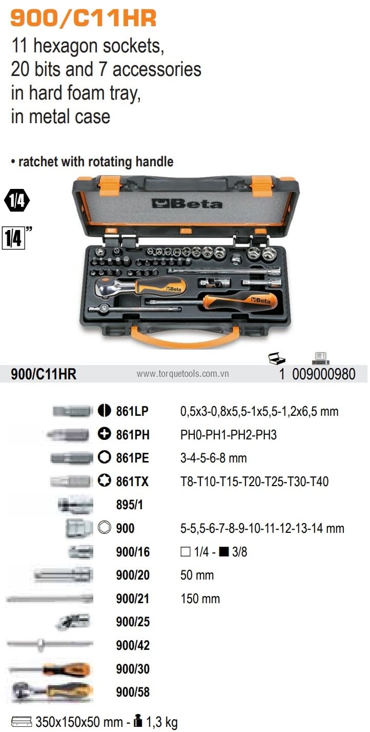 Bộ khẩu BETA 900/C11HR, BETA socket set 900/C11HR có 39 chi tiết, size khẩu đầu vào 1/4", chuyên dùng để siết/vặn bulong, đai ốc, vít trong công nghiệp.Các chi tiết trong bộ khẩu BETA 900/C11HR gồm: