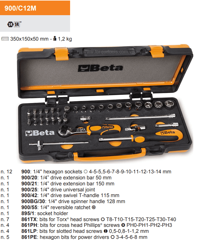 Bộ khẩu BETA 900/C12M, BETA socket set 900/C12M có 39 chi tiết, size khẩu đầu vào 1/4", chuyên dùng để siết/vặn bulong, đai ốc, vít trong công nghiệp.Các chi tiết trong bộ khẩu BETA 900/C12M gồm: