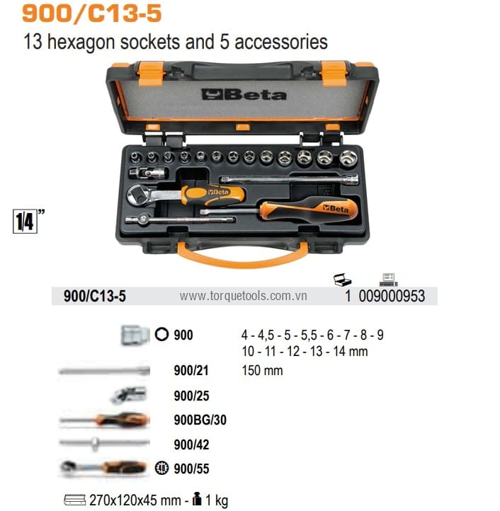 Bộ khẩu BETA 900/C13-5, BETA socket set 900/C13-5 có 18 chi tiết, size khẩu đầu vào 1/4", chuyên dùng để siết/vặn bulong, đai ốc, vít trong công nghiệp.Các chi tiết trong bộ khẩu BETA 900/C13-5 gồm: