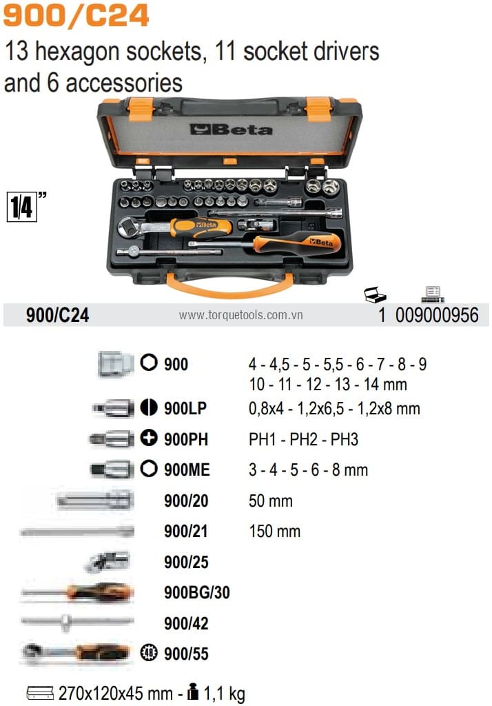 Bộ khẩu BETA 900/C24, BETA socket set 900/C24 có 30 chi tiết, size khẩu đầu vào 1/4", chuyên dùng để siết/vặn bulong, đai ốc, vít trong công nghiệp.Các chi tiết trong bộ khẩu BETA 900/C24 gồm: