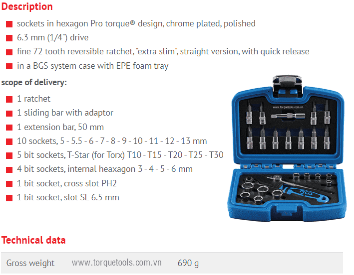 Toàn bộ bộ khẩu BGS 2140 đóng trong hộp nhựa, trọng lượng: 690 g. Made in USA.