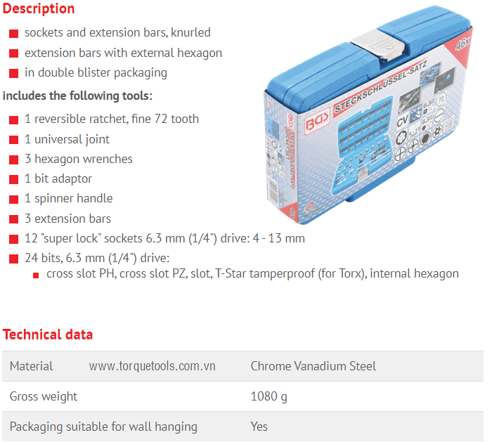 Toàn bộ bộ khẩu BGS 2144 đóng trong hộp nhựa, trọng lượng: 1.080 kg. Made in USA.