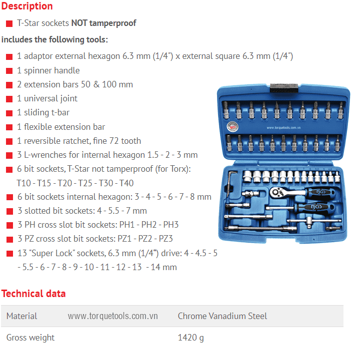 Toàn bộ bộ khẩu BGS 2145 đóng trong hộp nhựa, trọng lượng: 1.420 kg. Made in USA.