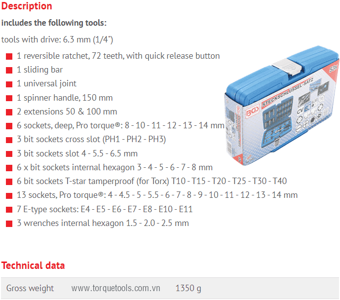 Toàn bộ bộ khẩu BGS 2147 đóng trong hộp nhựa, trọng lượng: 1.350 kg. Made in USA.
