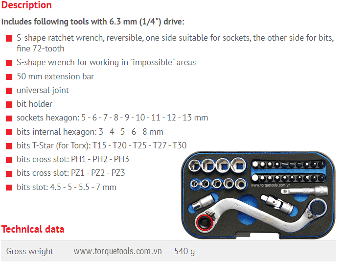 - Vít cắm khẩu 6 cạnh tiêu chuẩn TorX (T15-T30): 5 chiếc.