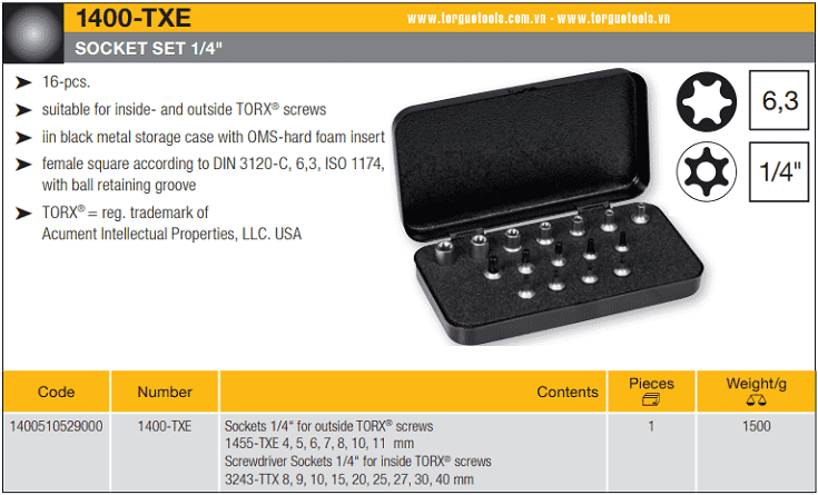 - Khẩu 1/4", 6 cạnh tiêu chuẩn Torx(1455-TXE) (4 - 11 mm): 7 chiếc.