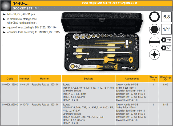BỘ KHẨU ELORA 1440-AU | ELORA SOCKET SET 1440-AU | 1/4" | 31 chi tiết