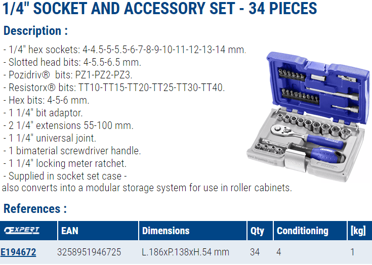 BỘ KHẨU EXPERT E194672 | EXPERT SOCKET SET E194672 | 1/4" | 34 chi tiết