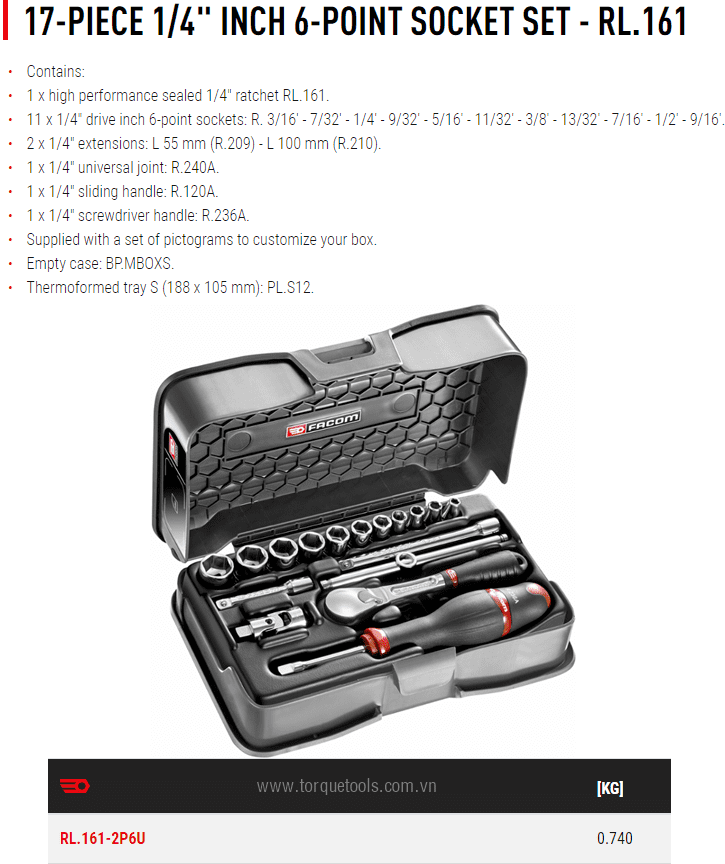 Bộ dụng cụ Facom RL.161-2P6U, bộ khẩu Facom RL.161-2P6U là hộp dụng cụ 17 chi tiết, size khẩu đầu vào 1/4", chuyên dùng để siết/vặn bulong, đai ốc, vít trong công nghiệp.Các chi tiết trong bộ khẩu Facom RL.161-2P6U gồm: