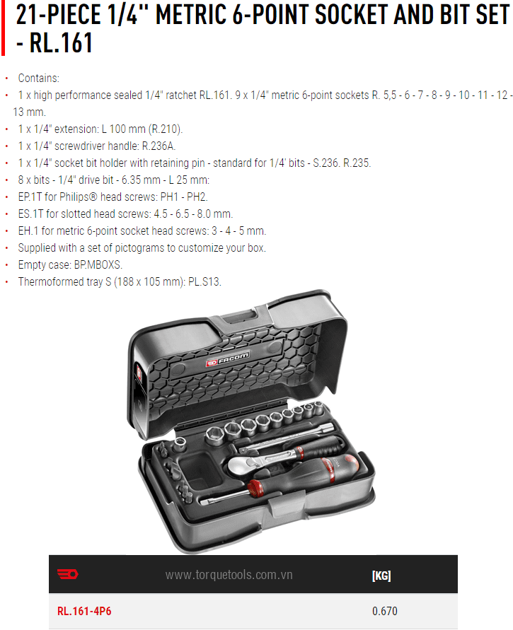 Bộ dụng cụ Facom RL.161-4P6, bộ khẩu Facom RL.161-4P6 là hộp dụng cụ 21 chi tiết, size khẩu đầu vào 1/4", chuyên dùng để siết/vặn bulong, đai ốc, vít trong công nghiệp.Các chi tiết trong bộ khẩu Facom RL.161-4P6 gồm: