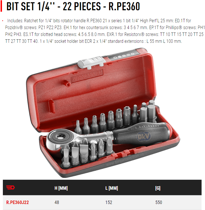 - Toàn bộ bộ khẩu Facom R.PE360J22 đóng trong hộp nhựa, trọng lượng: 0.55 kg. Made in France.