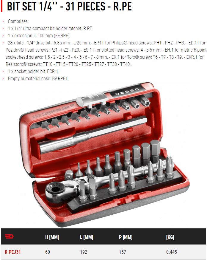 Bộ dụng cụ Facom R.PEJ31, bộ khẩu Facom R.PEJ31 là hộp dụng cụ 31 chi tiết, size khẩu đầu vào 1/4", chuyên dùng để siết/vặn bulong, đai ốc, vít trong công nghiệp.Các chi tiết trong bộ khẩu Facom R.PEJ31 gồm: