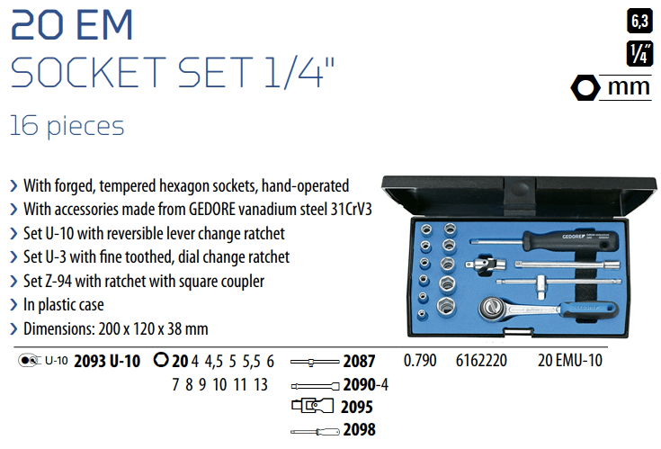 Bộ khẩu Gedore 20 EMU-10, Gedore socket set 20 EMU-10 thuộc dòng sản phẩm chất lượng cao, có 16 chi tiết, size khẩu đầu vào 1/4", đóng trong hộp nhựa, chuyên dùng để siết/vặn bulong, đai ốc, vít trong công nghiệp.Các chi tiết trong bộ khẩu Gedore 20 EMU-10 gồm: