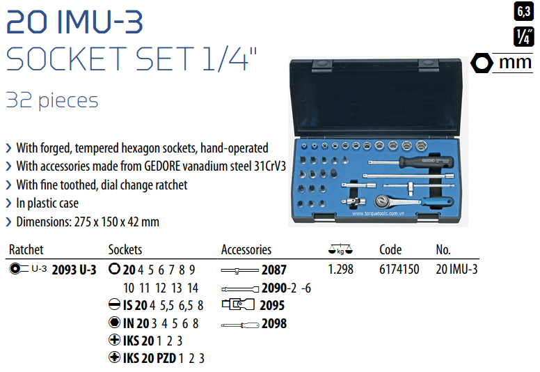 Bộ khẩu Gedore 20 IMU-3, Gedore socket set 20 IMU-3 thuộc dòng sản phẩm chất lượng cao, có 32 chi tiết, size khẩu đầu vào 1/4", đóng trong hộp nhựa, chuyên dùng để siết/vặn bulong, đai ốc, vít trong công nghiệp.Các chi tiết trong bộ khẩu Gedore 20 IMU-3 gồm: