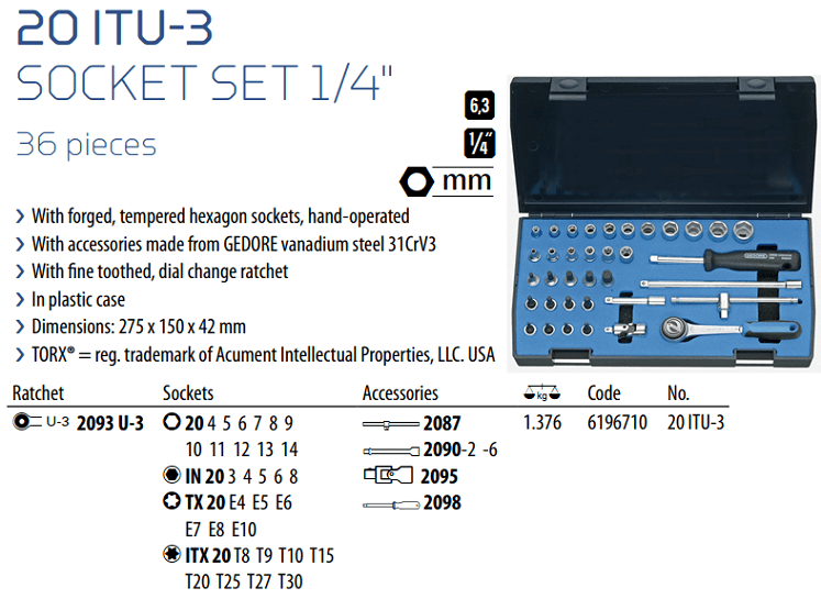 Bộ khẩu Gedore 20 ITU-3, Gedore socket set 20 ITU-3 thuộc dòng sản phẩm chất lượng cao, có 36 chi tiết, size khẩu đầu vào 1/4", đóng trong hộp nhựa, chuyên dùng để siết/vặn bulong, đai ốc, vít trong công nghiệp.Các chi tiết trong bộ khẩu Gedore 20 ITU-3 gồm: