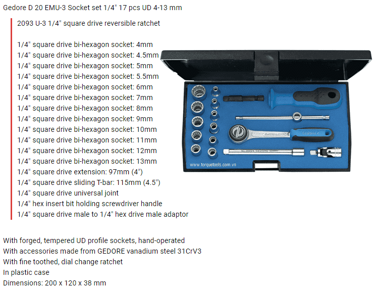 Bộ khẩu Gedore D 20 EMU-3, Gedore socket set D 20 EMU-3 thuộc dòng sản phẩm chất lượng cao, có 17 chi tiết, đóng trong hộp thép, chuyên dùng để siết/vặn bulong, đai ốc trong công nghiệp.Các chi tiết trong bộ khẩu Gedore D 20 EMU-3 gồm: