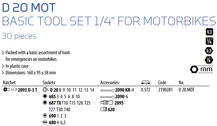 Toàn bộ bộ khẩu Gedore D 20 MOT đóng trong hộp nhựa (160 x 95 x 38 mm), trọng lượng: 0.572 kg. Made in Germany.