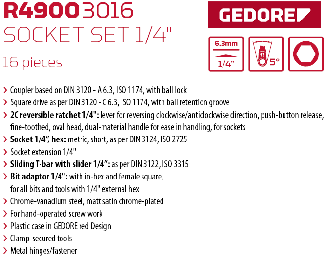 - Bộ dụng cụ Gedore Red R49003016, bộ khẩu Gedore Red R49003016 là hộp dụng cụ 16 chi tiết, trong đó có 12 khẩu 1/4" loại ngắn (4 - 13 mm), một khẩu kéo dài và một tay vặn đa năng.