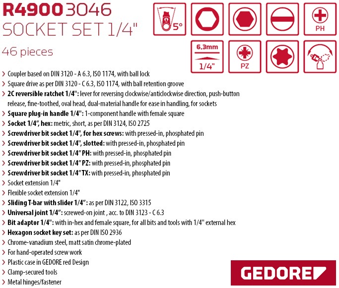 - Bộ dụng cụ Gedore Red R49003046, bộ khẩu Gedore Red R49003046 là hộp dụng cụ 46 chi tiết, trong đó có 13 khẩu 1/4" loại ngắn (4 - 14 mm), hai khẩu kéo dài, một tay vặn đa năng và các đầu khẩu vít.