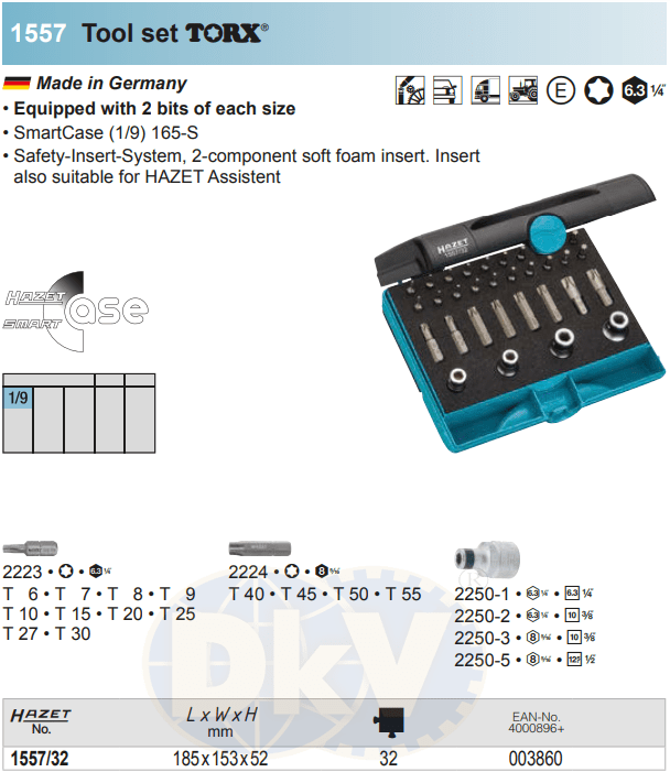 Bộ dụng cụ Hazet 1557/32, bộ khẩu Hazet 1557/32 (Code: 4000896003860) là hộp dụng cụ 32 chi tiết,size khẩu đầu vào 1/4", chuyên dùng để siết/vặn bulong, đai ốc, vít trong công nghiệp.Các chi tiết trong bộ khẩu Hazet 1557/32 gồm: