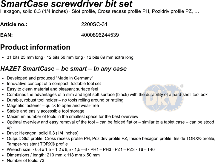 Toàn bộ bộ đầu vít Hazet 2200SC/31 đóng trong hộp nhựa 210 x 118 x 50 mm. Made in Germany.