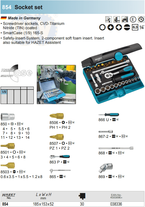 Bộ dụng cụ Hazet 854, bộ khẩu Hazet 854 (Code: 4000896038336) là hộp dụng cụ 30 chi tiết,size khẩu đầu vào 1/4", chuyên dùng để siết/vặn bulong, đai ốc, vít trong công nghiệp.Các chi tiết trong bộ khẩu Hazet 854 gồm: