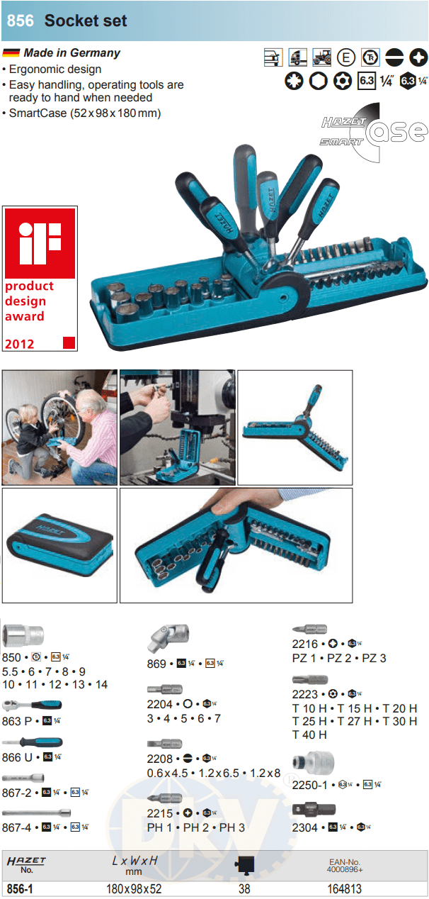 Bộ dụng cụ Hazet 856-1, bộ khẩu Hazet 856-1 (Code: 4000896164813) là hộp dụng cụ 38 chi tiết,size khẩu đầu vào 1/4", chuyên dùng để siết/vặn bulong, đai ốc, vít trong công nghiệp.Các chi tiết trong bộ khẩu Hazet 856-1 gồm: