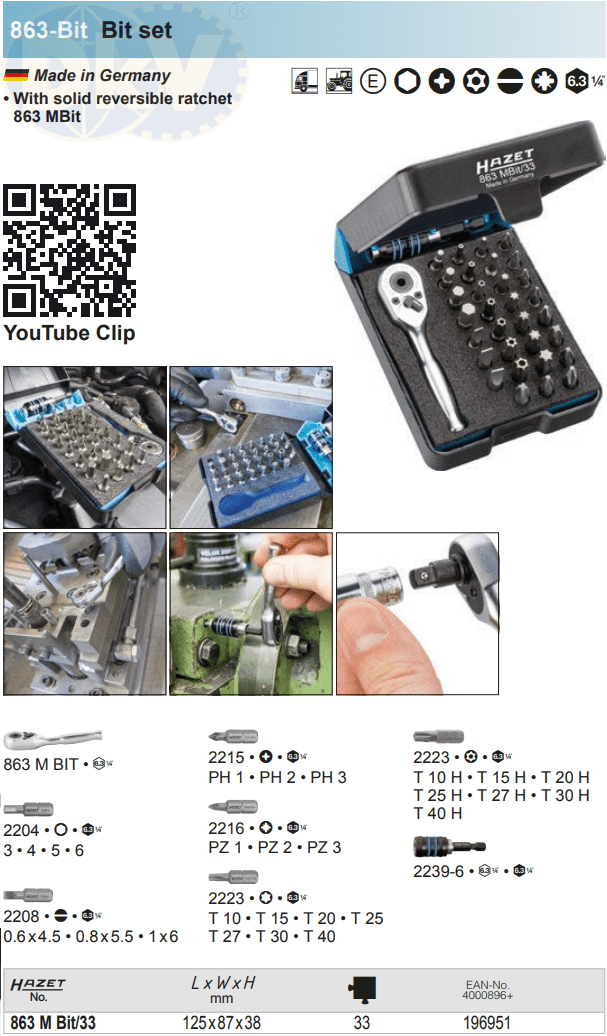 Bộ dụng cụ Hazet 863MBIT/33, bộ khẩu Hazet 863MBIT/33 (Code: 400896196951) là hộp dụng cụ 33 chi tiết,size khẩu đầu vào 1/4", chuyên dùng để siết/vặn bulong, đai ốc, vít trong công nghiệp.Các chi tiết trong bộ khẩu Hazet 863MBIT/33 gồm: