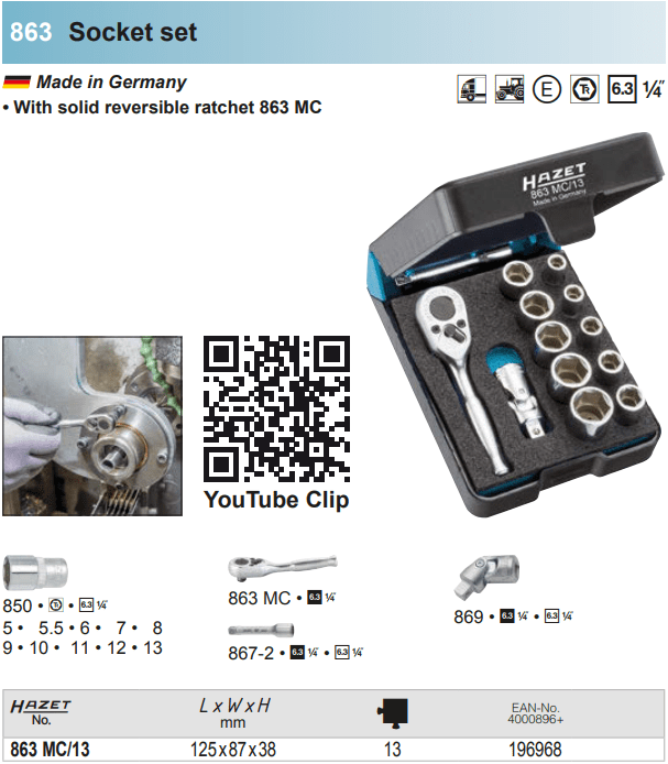 Bộ dụng cụ Hazet 863MC/13, bộ khẩu Hazet 863MC/13 (Code: 400896196968) là hộp dụng cụ 13 chi tiết,size khẩu đầu vào 1/4", chuyên dùng để siết/vặn bulong, đai ốc, vít trong công nghiệp.Các chi tiết trong bộ khẩu Hazet 863MC/13 gồm: