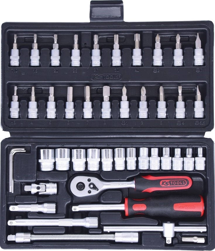 Bộ dụng cụ Ks Tools 911.0646, bộ khẩu Ks Tools 911.0646 là hộp dụng cụ 46 chi tiết, size khẩu đầu vào 1/4", chuyên dùng để siết/vặn bulong, đai ốc, vít trong công nghiệp.Các chi tiết trong bộ khẩu Ks Tools 911.0646 gồm: