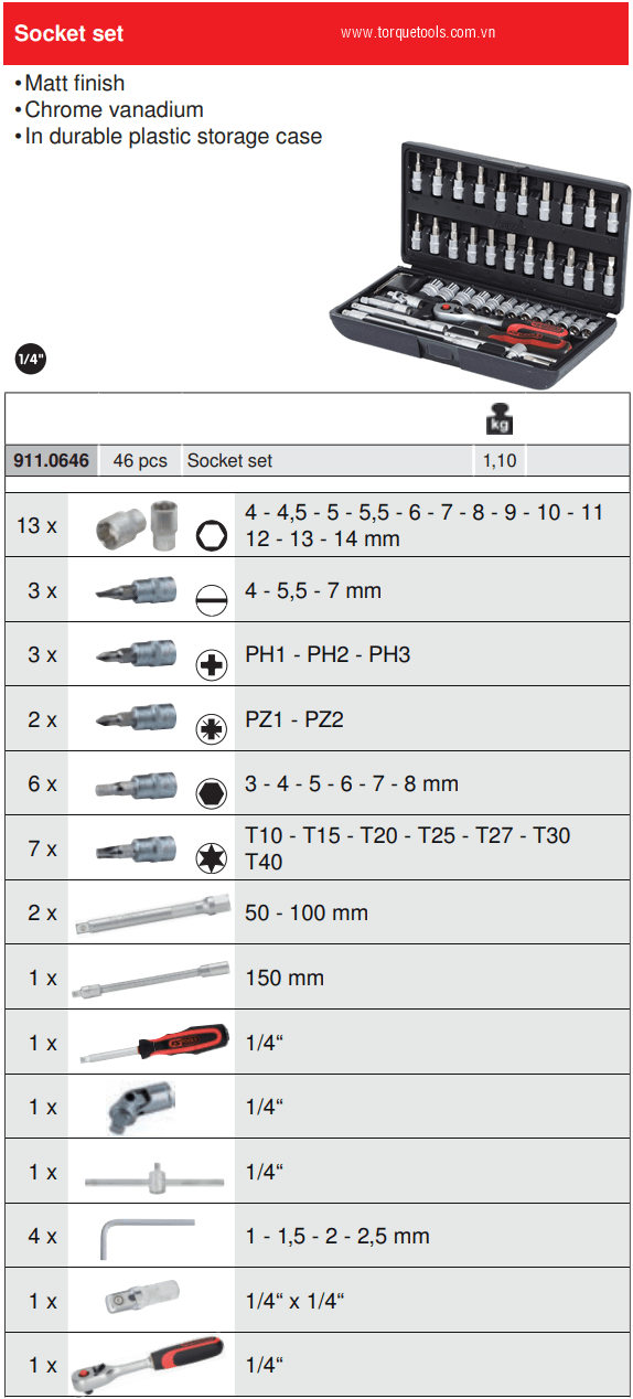 - Khẩu 6 cạnh 1/4"(4-14 mm): 13 chiếc.